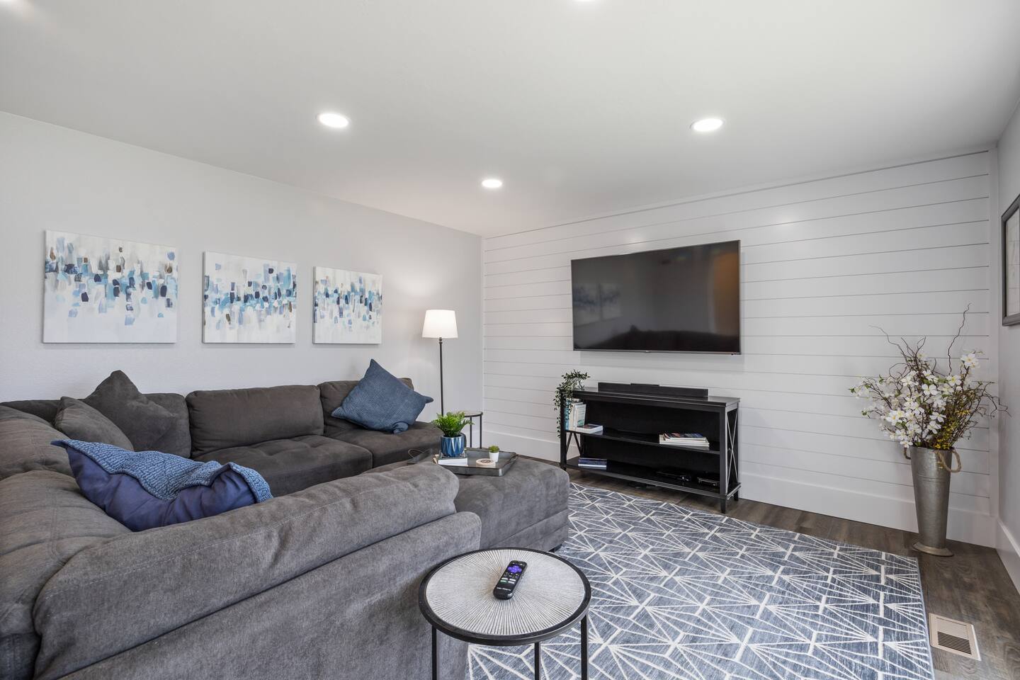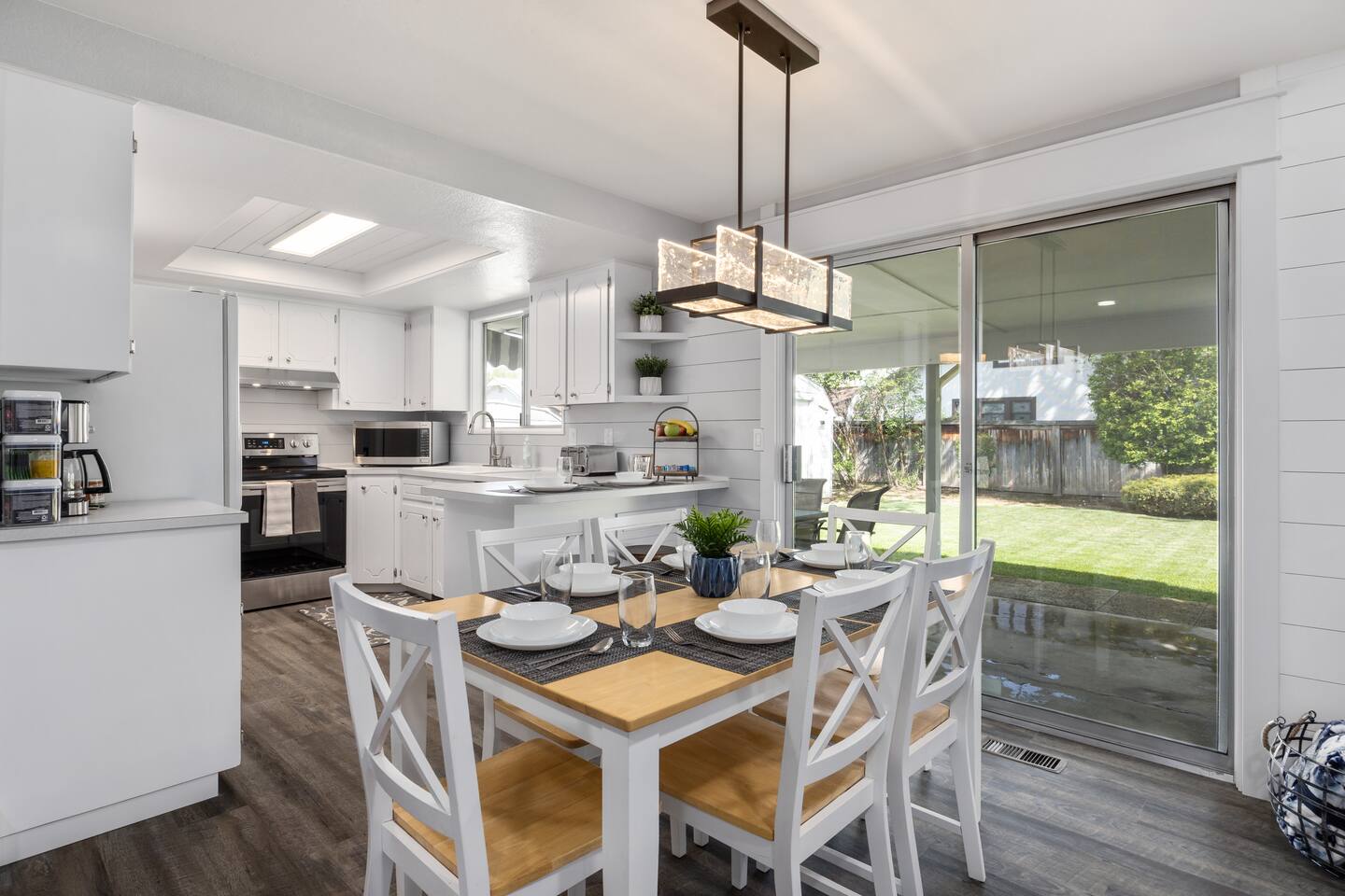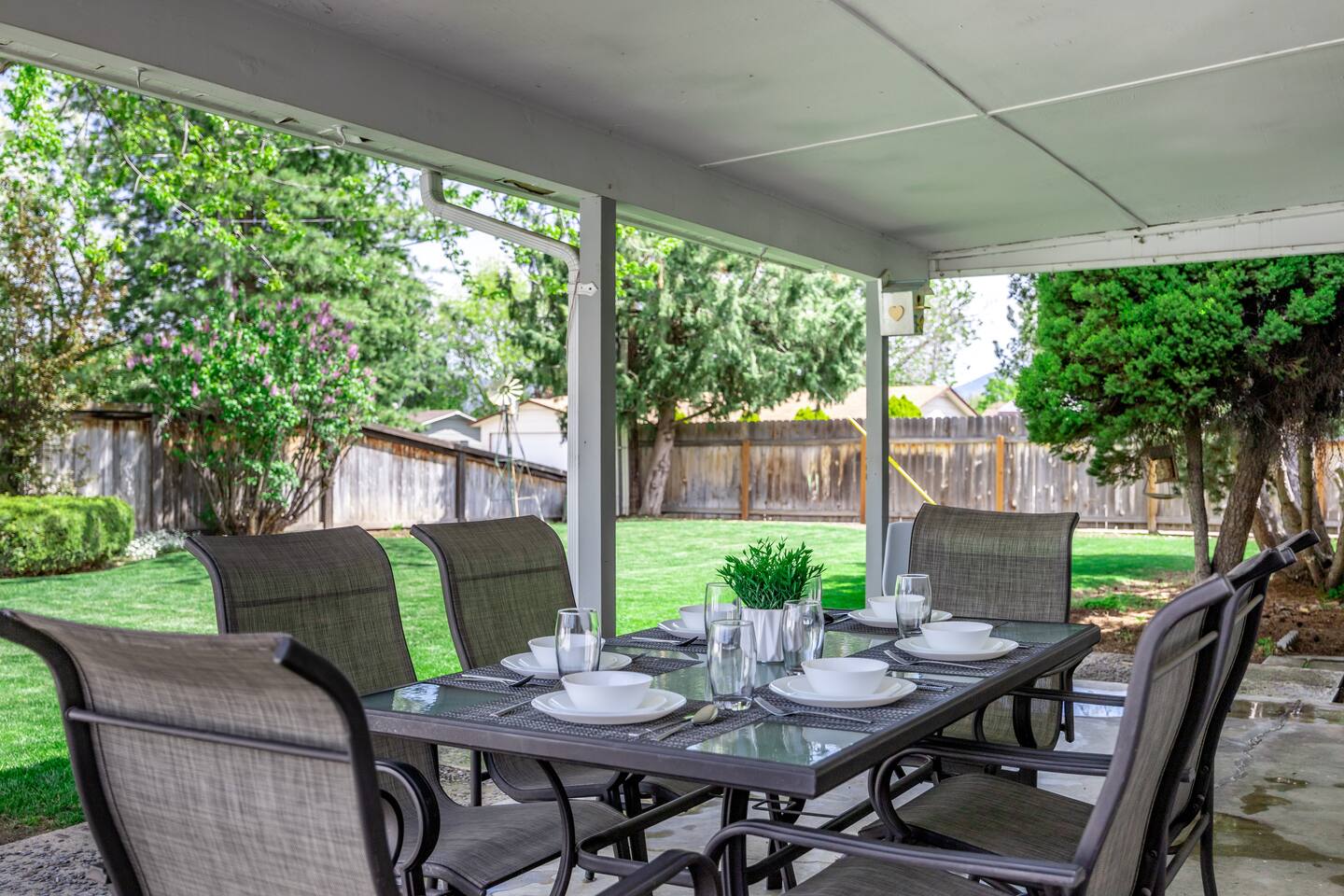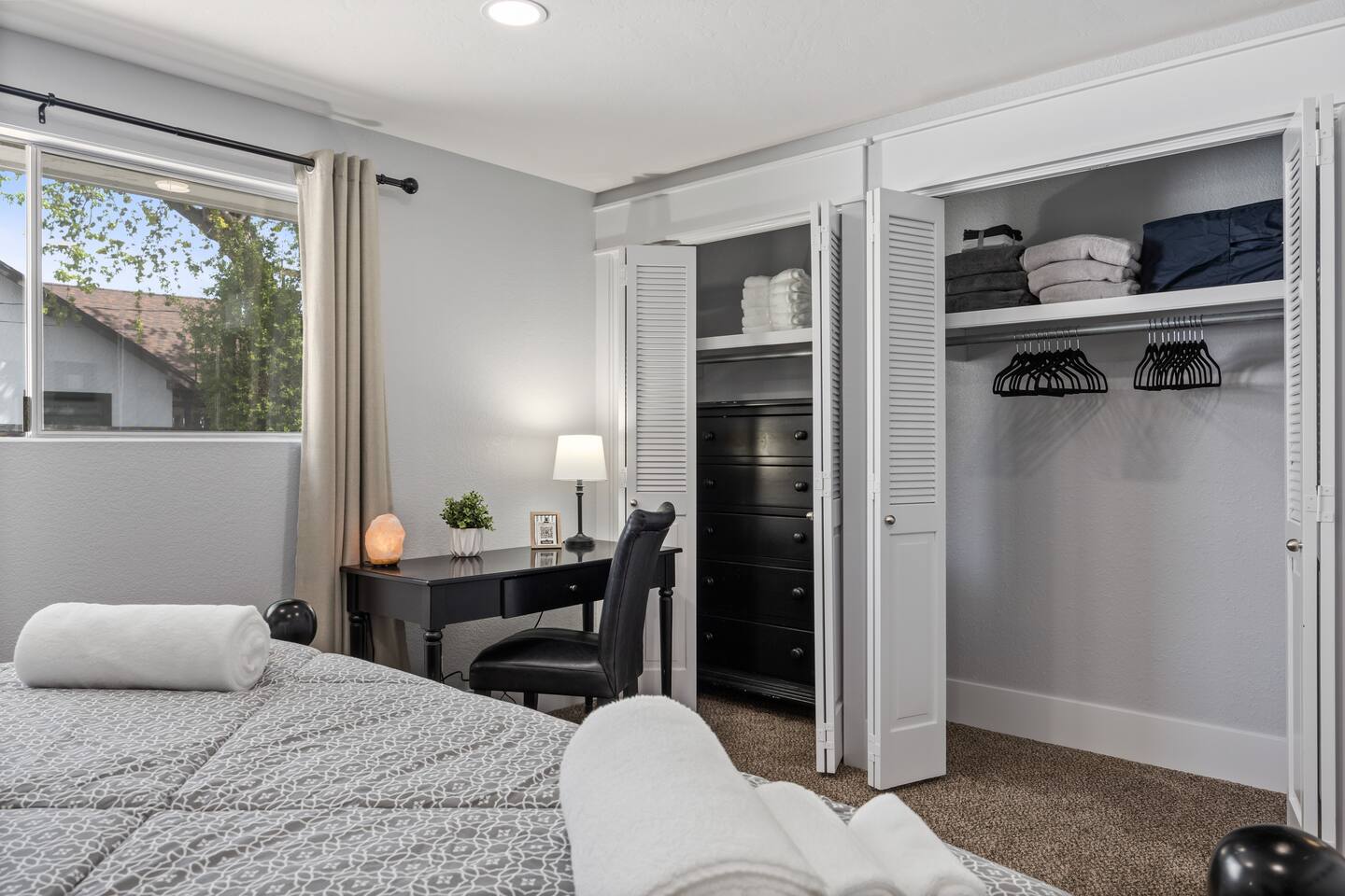 Calming, clean, bright, and newly remodeled suburban retreat. 2 parks with playgrounds in the neighborhood. King Mattress Suite with bathroom overlooks the spacious backyard All bedrooms have 14" Gel Memory Foam Mattress Master and Bedroom 2 have a workspace. 2 separate gathering rooms The front room has Smart Big Screen, surround sound, and large sectional. Separate Great Room with TV is open to kitchen and dining space. Spacious fenced backyard with large patio and outdoor dining area.