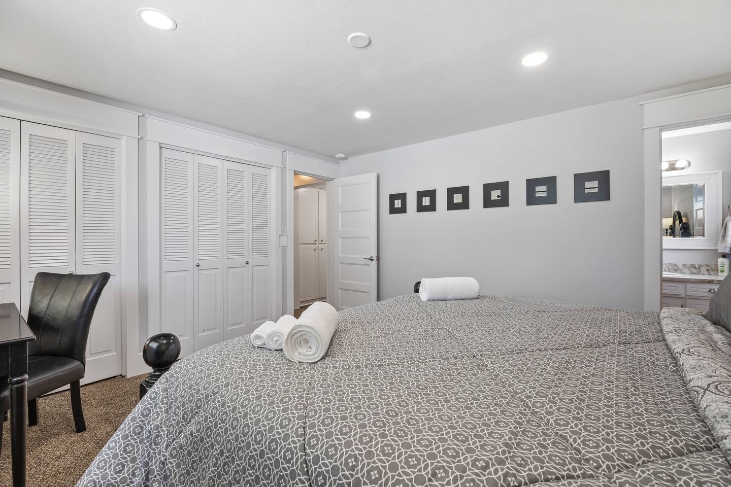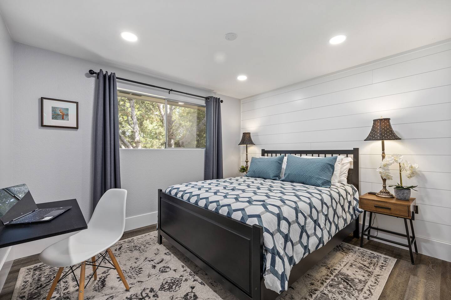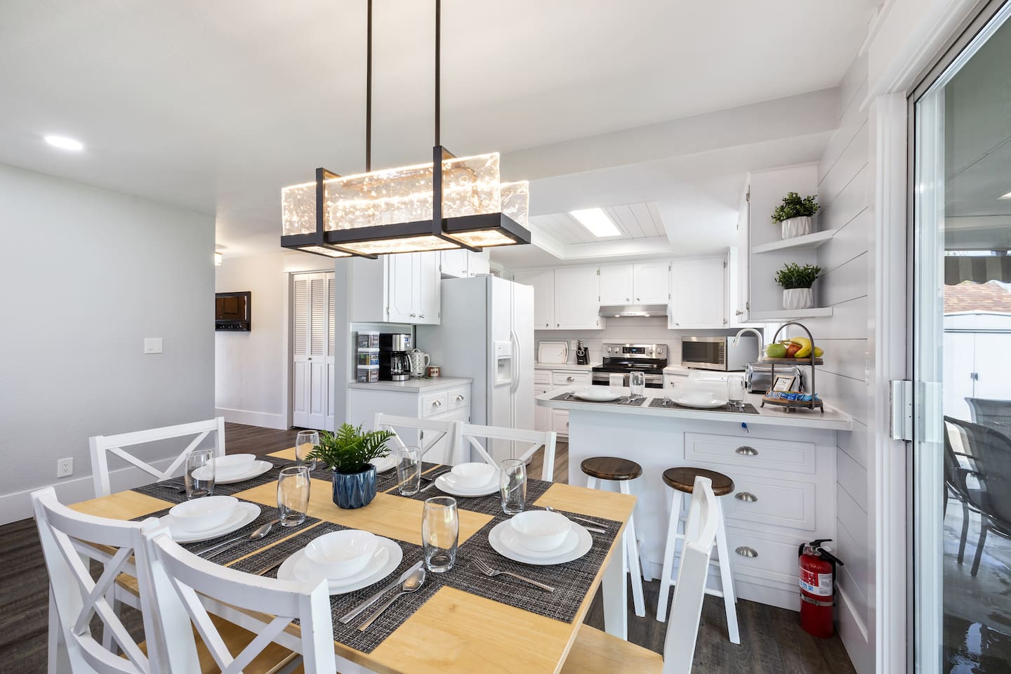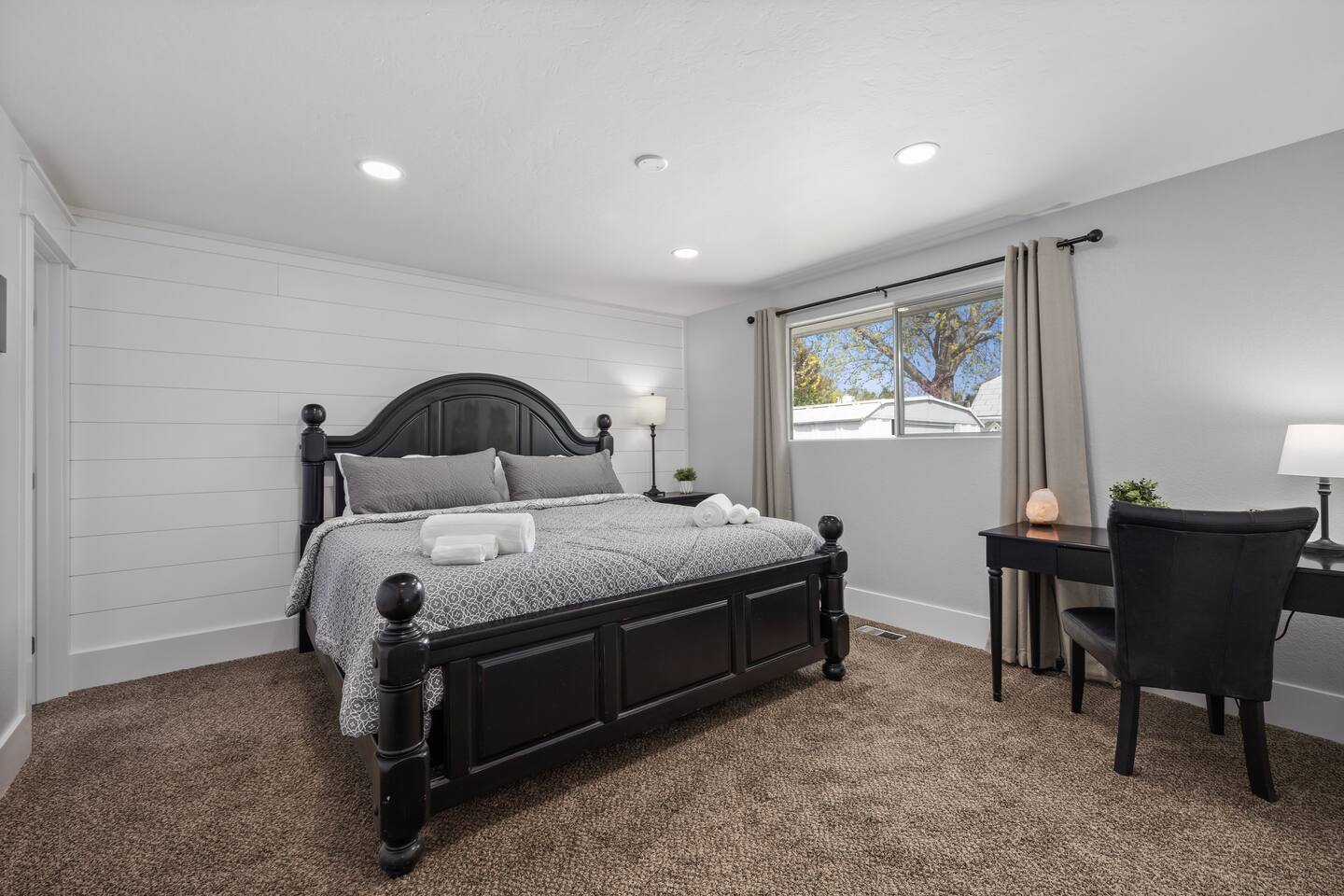 Calming, clean, bright, and newly remodeled suburban retreat. 2 parks with playgrounds in the neighborhood. King Mattress Suite with bathroom overlooks the spacious backyard All bedrooms have 14" Gel Memory Foam Mattress Master and Bedroom 2 have a workspace. 2 separate gathering rooms The front room has Smart Big Screen, surround sound, and large sectional. Separate Great Room with TV is open to kitchen and dining space. Spacious fenced backyard with large patio and outdoor dining area.