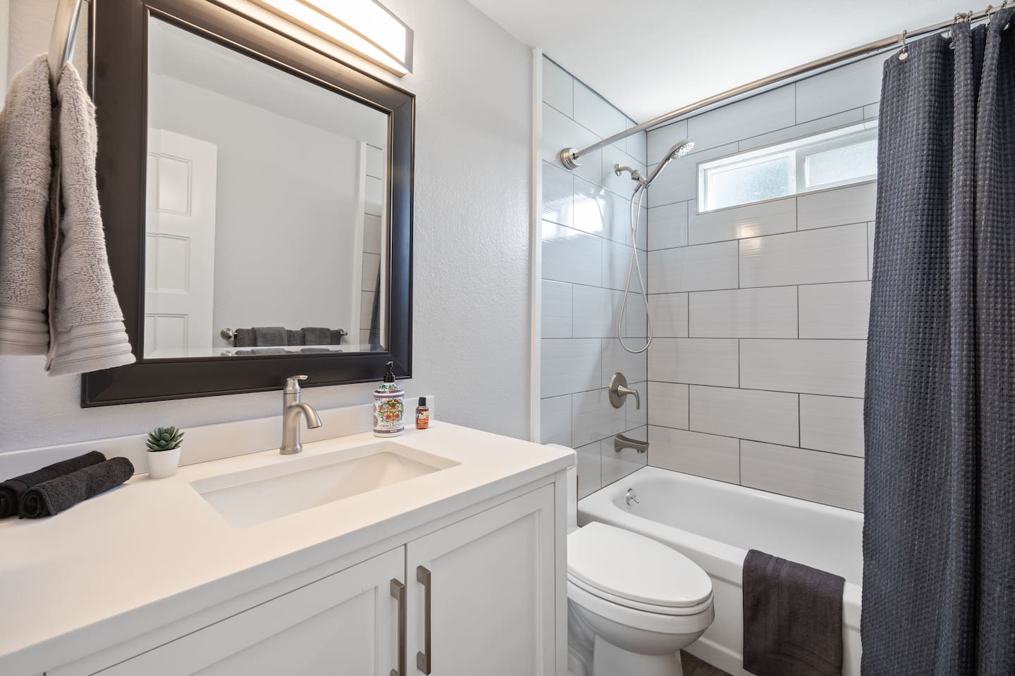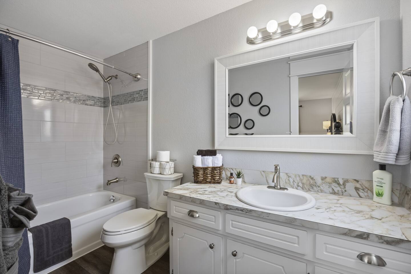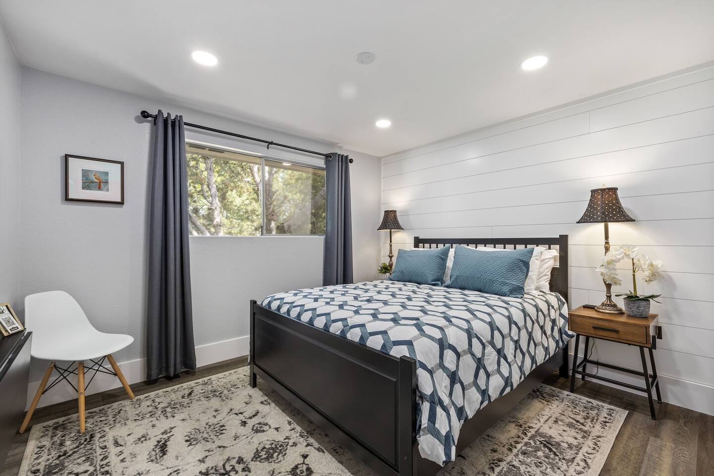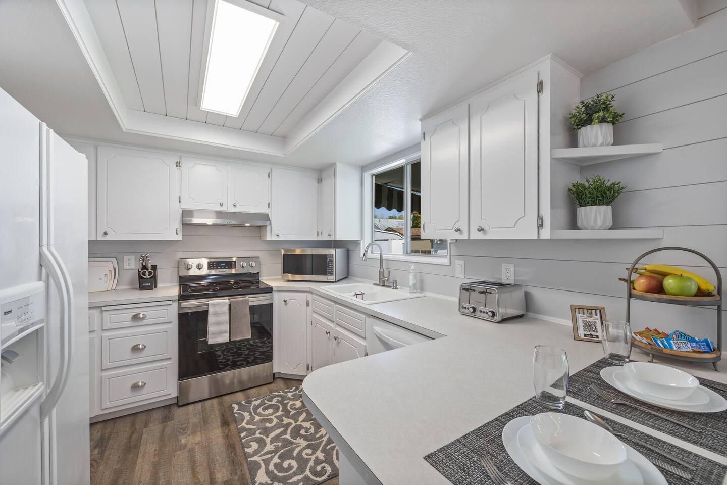 Calming, clean, bright, and newly remodeled suburban retreat. 2 parks with playgrounds in the neighborhood. King Mattress Suite with bathroom overlooks the spacious backyard All bedrooms have 14" Gel Memory Foam Mattress Master and Bedroom 2 have a workspace. 2 separate gathering rooms The front room has Smart Big Screen, surround sound, and large sectional. Separate Great Room with TV is open to kitchen and dining space. Spacious fenced backyard with large patio and outdoor dining area.